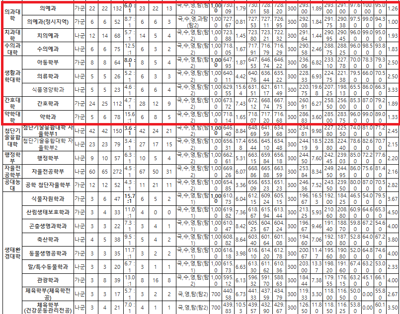 특히 의예과, 치의예과, 약학과 같은 의약계열은 모든 전형에서 높은 성적과 경쟁률을 기록했다는 점을 확인할 수 있었죠.