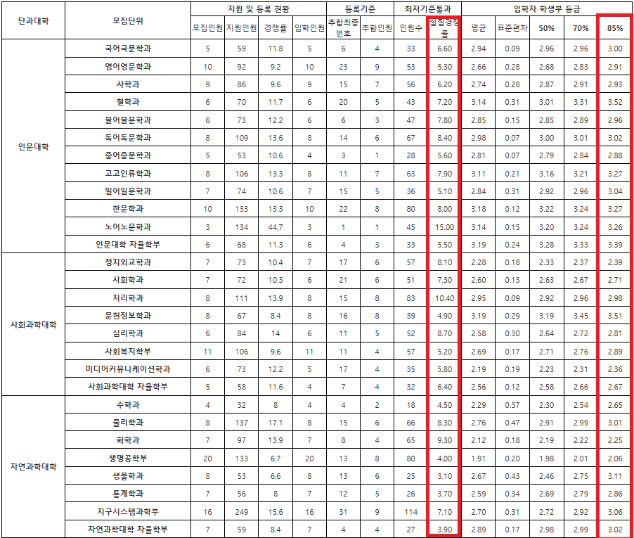 모집 단위별로 입학자 성적을 직접 비교해 보면서 본인에게 유리한 전형이 무엇인지 판단하는 데 큰 도움이 될 거예요.