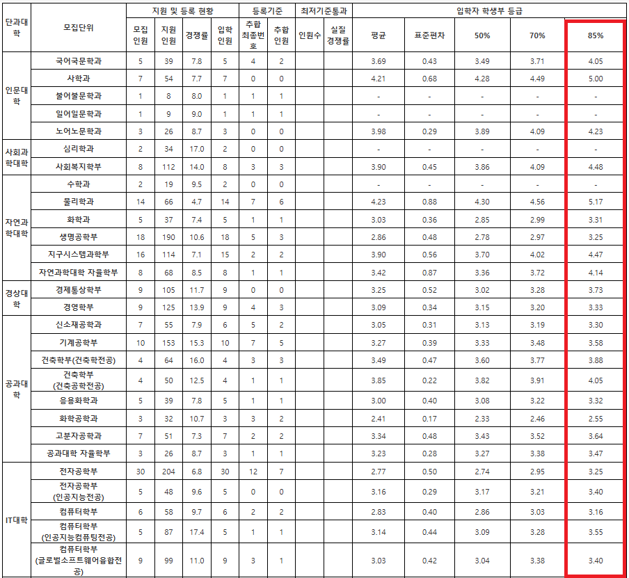각 전형별로 어떤 특징이 있었고, 어떤 학과들이 높은 경쟁률과 합격 등급을 기록했는지 알아볼 수 있죠.