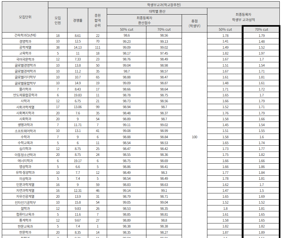 반면 최종 등록자의 교과 성적 50% 컷 기준으로는 전자전기공학부가 1.90으로 가장 우수한 성적을 보였죠.
