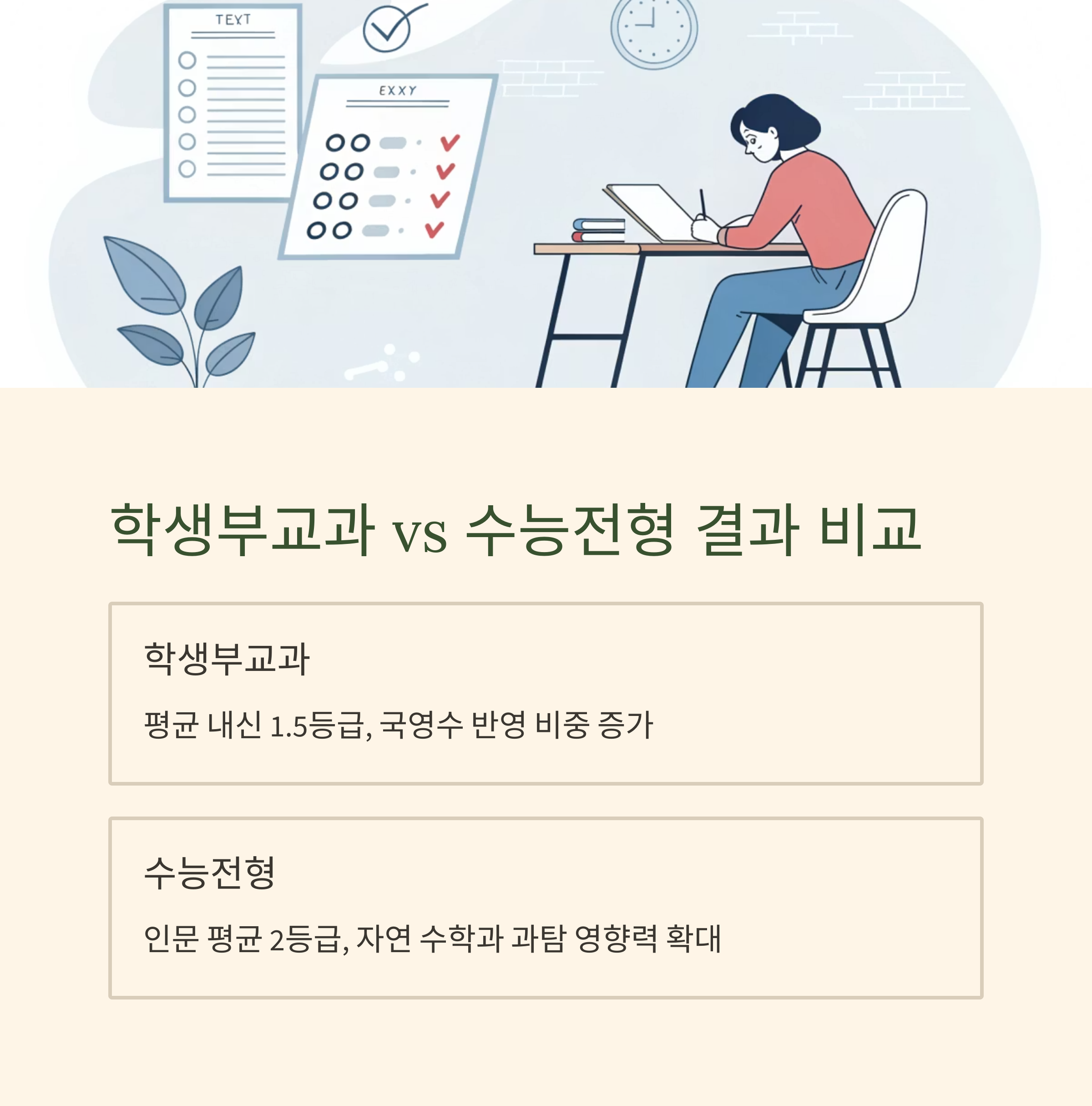 자신의 강점을 살려 가장 유리한 전형을 선택하고, 남은 기간 최선을 다해 좋은 결과를 얻기를 응원할게요!