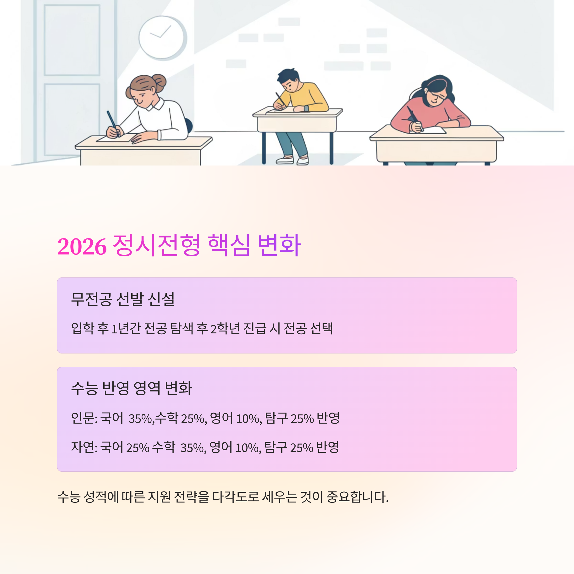 특히 학생부종합전형의 변화와 정시의 무전공 선발 확대가 주목할 만하죠.