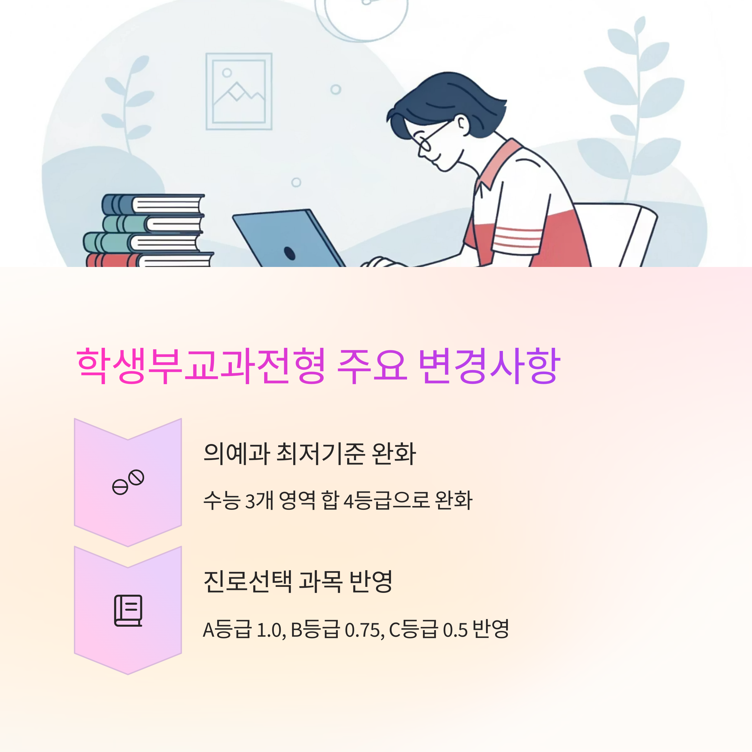 2026학년도 입시도 학생들에게 유리한 방향으로 바뀌는 것 같으니 잘 준비하시면 좋은 결과가 있을 거예요.