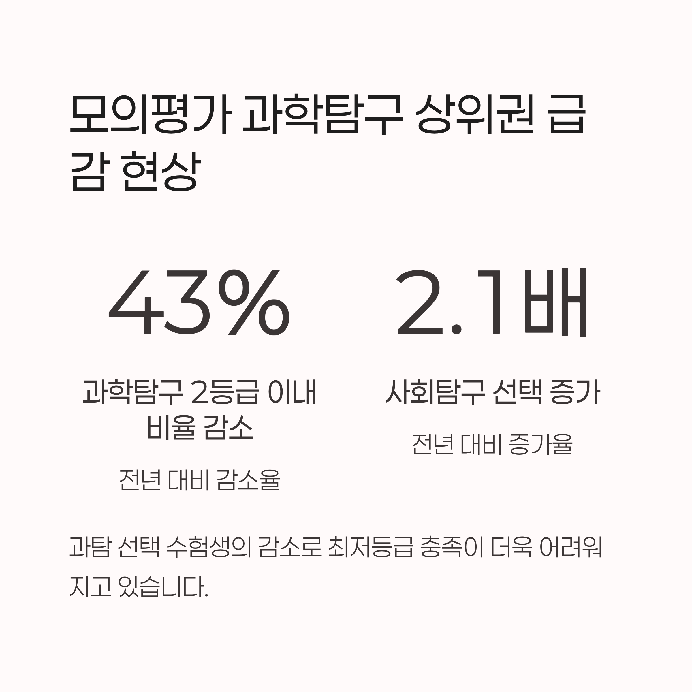 | 마무리 조언 수능 최저등급은 대학이 요구하는 최소한의 기준이에요. 과학탐구 과목의 등급 확보가 어려워진 만큼 더 깊이 있는 학습을 통해 변수에 대비하는 것이 현명한 선택이에요. |