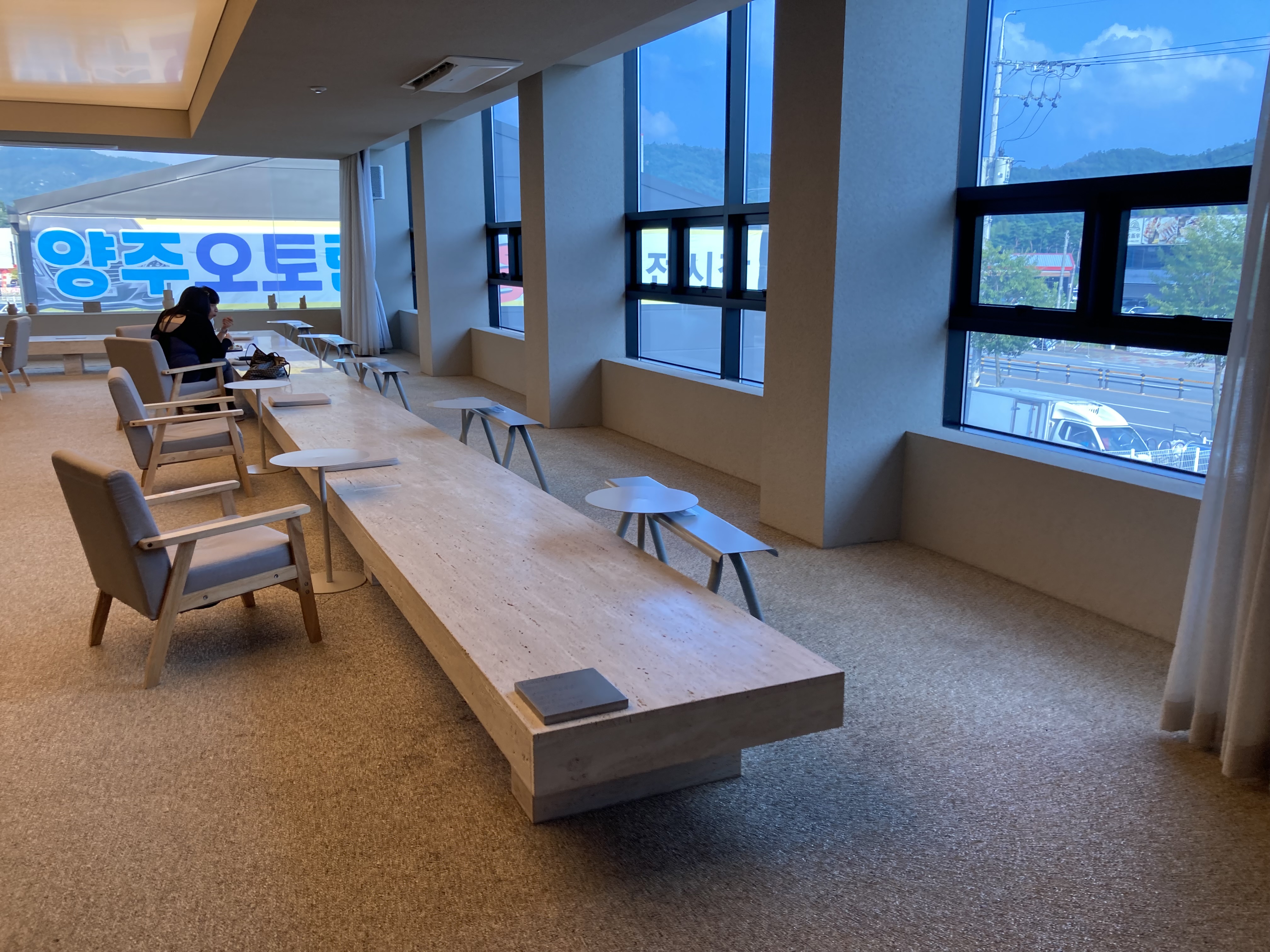 2층은 멋진 대리석으로 된 테이블겸 의자가 길게 뻗어있어요.
